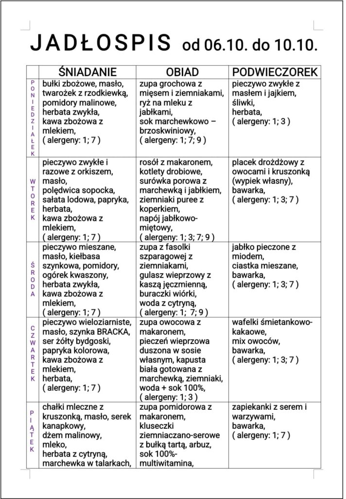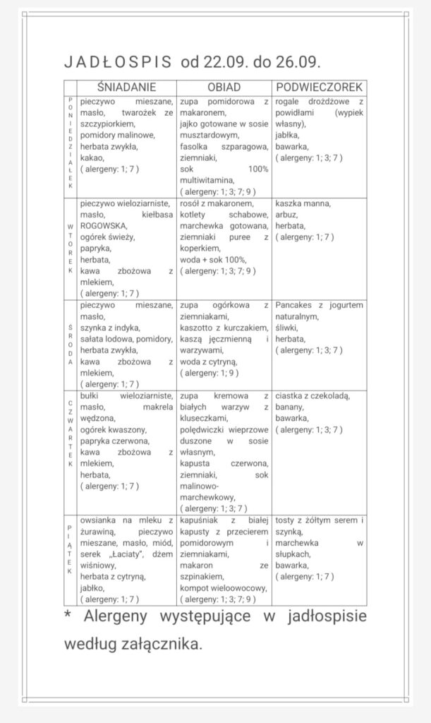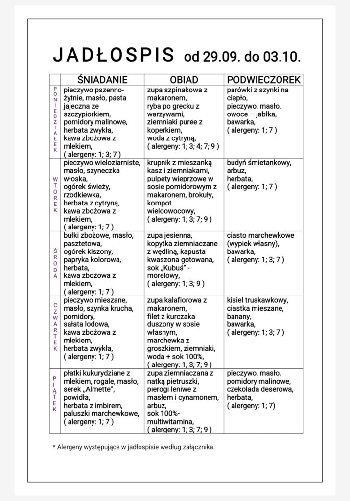 | C Z W A R T E K | pieczywo mieszane, masło, polędwica sopocka, papryka, ogórek kwaszony, kawa zbożowa z mlekiem, herbata zwykła, ( alergeny: 1; 7 ) | zupa leningradzka z ziemniakami, i kaszą jęczmienną, pulpety wieprzowa w sosie pomidorowym z makaronem, brokuły, woda + sok 100%, ( alergeny: 1; 3; 7; 9 ) | kaszka manna, owoce, herbata, ( alergeny: 1; 7 ) |