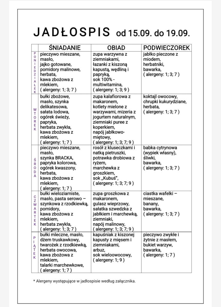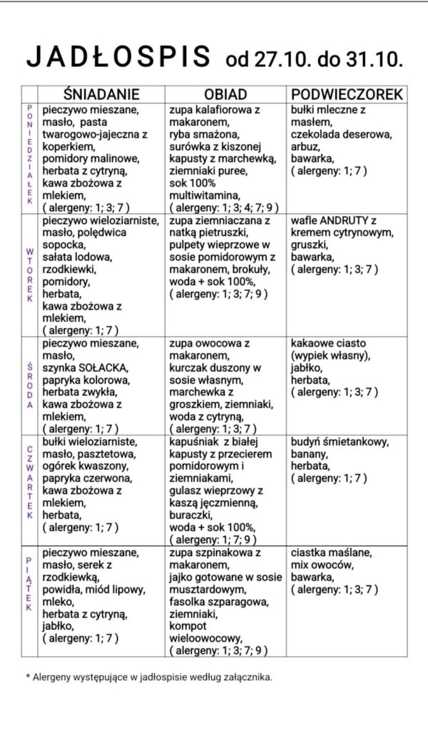 | Ś R O D A | bułki wieloziarniste, masło, twarożek z zielonym ogórkiem, papryka, rzodkiewka, herbata zwykła, kawa zbożowa z mlekiem, ( alergeny: 1; 7 ) | rosół z makaronem, kurczak duszony w sosie własnym, marchewka gotowana, ziemniaki, kompot wieloowocowy, ( alergeny: 1; 3; 7; 9 ) | galaretka truskawkowa, ciastka – herbatniki, pomarańcza, bawarka, ( alergeny: 1; 3; 7 ) |