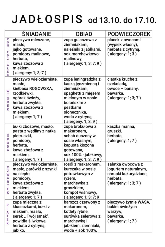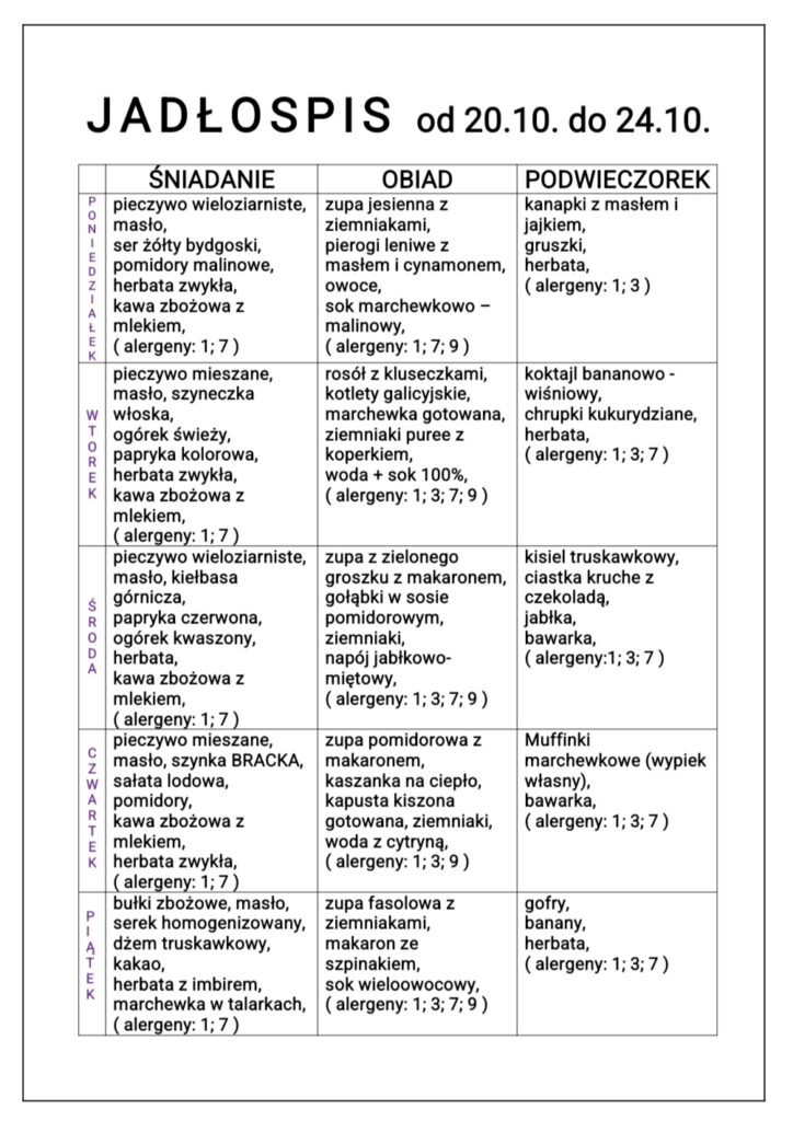 | P I Ą T E K | płatki kukurydziane z mlekiem, chałki, masło, serek ,,Łaciaty’’, powidła, herbata z cytryną, paluszki marchewkowe, ( alergeny: 1; 7 ) | zupa meksykańska z kukurydzą, ryż na mleku z masłem i bananami, napój ,,Kubuś”, ( alergeny: 1; 3; 7; 9 ) | pizza z warzywami i serem mozzarella, bawarka, ( alergeny: 1; 3; 7 ) |