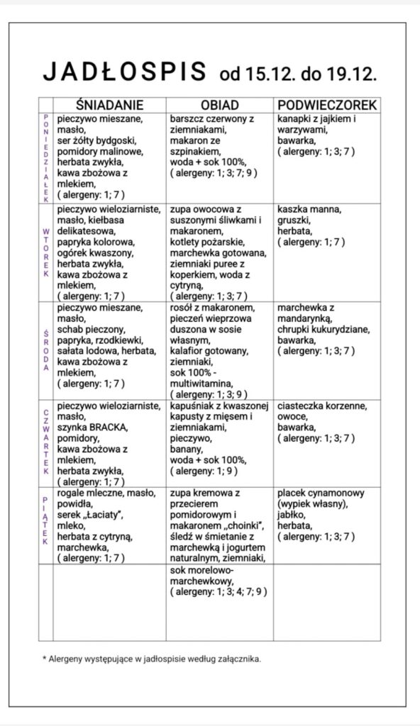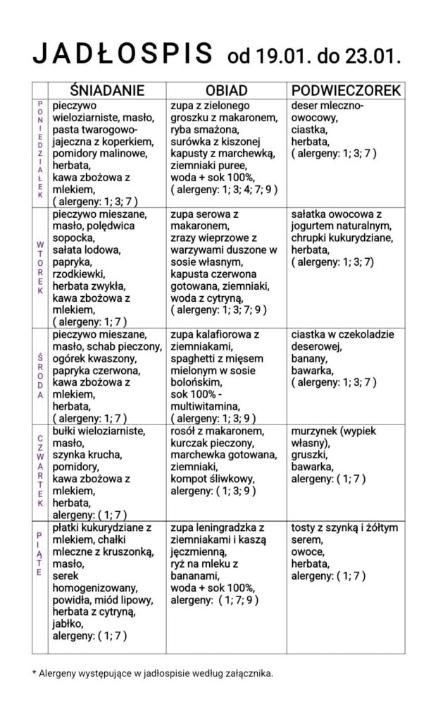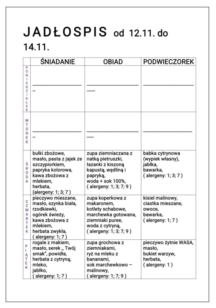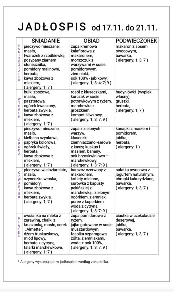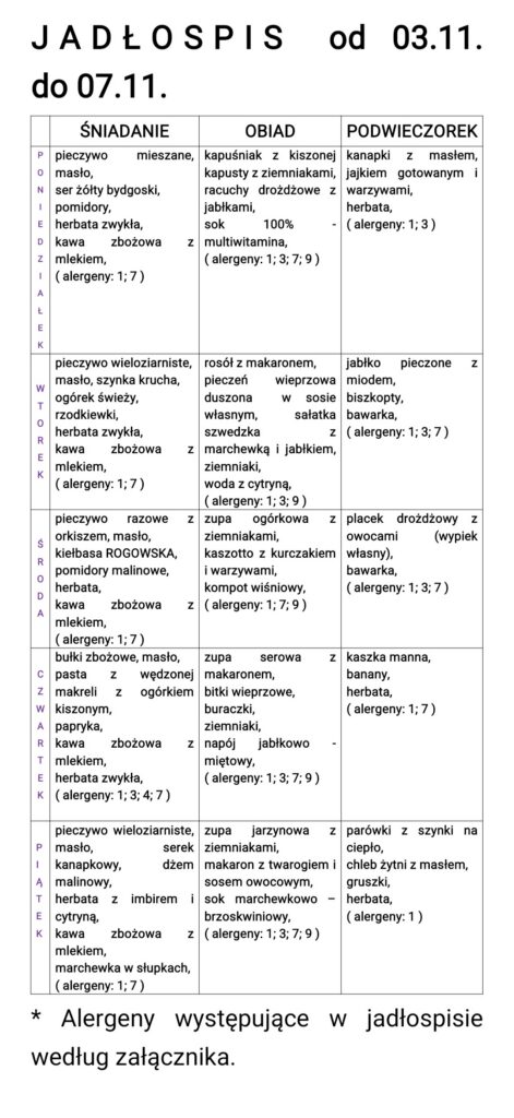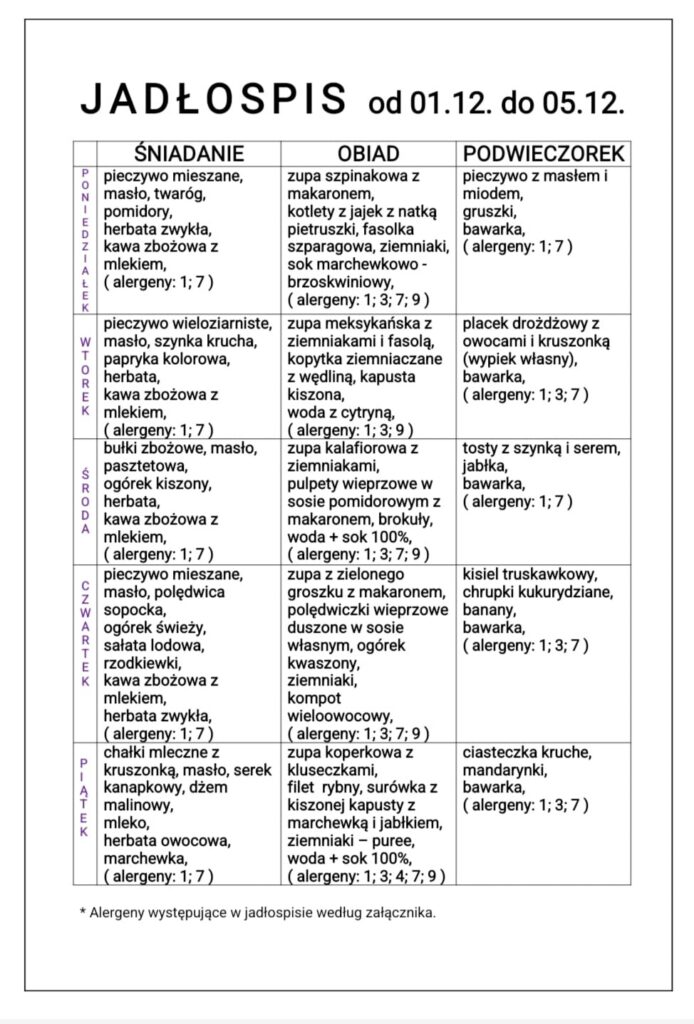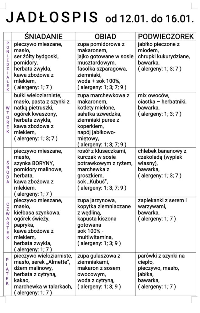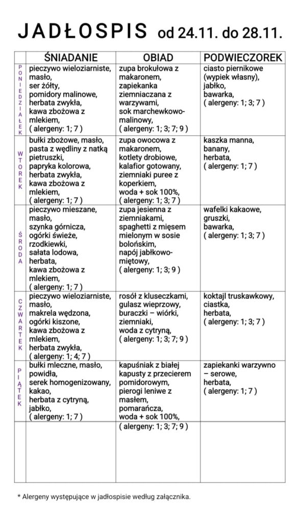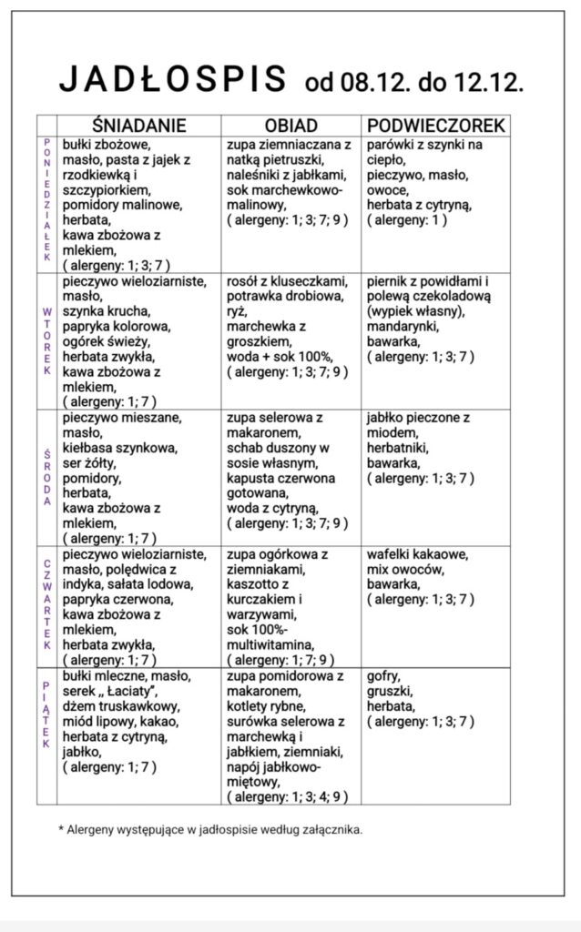 | C Z W A R T E K | pieczywo mieszane, masło, polędwica sopocka, papryka, ogórek kwaszony, kawa zbożowa z mlekiem, herbata zwykła, ( alergeny: 1; 7 ) | zupa leningradzka z ziemniakami, i kaszą jęczmienną, pulpety wieprzowa w sosie pomidorowym z makaronem, brokuły, woda + sok 100%, ( alergeny: 1; 3; 7; 9 ) | kaszka manna, owoce, herbata, ( alergeny: 1; 7 ) |