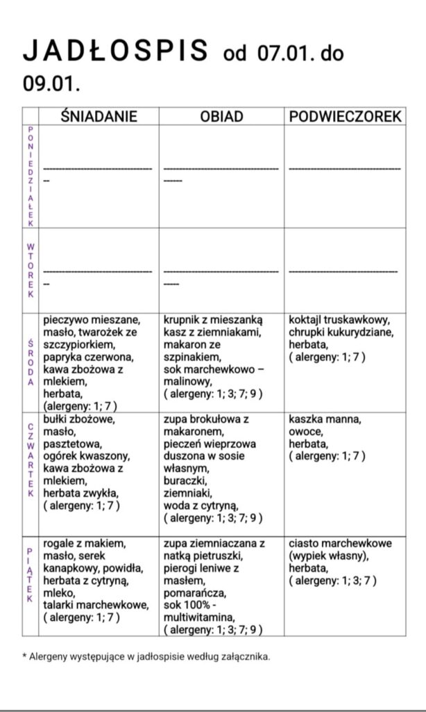 | Ś R O D A | bułki wieloziarniste, masło, twarożek z zielonym ogórkiem, papryka, rzodkiewka, herbata zwykła, kawa zbożowa z mlekiem, ( alergeny: 1; 7 ) | rosół z makaronem, kurczak duszony w sosie własnym, marchewka gotowana, ziemniaki, kompot wieloowocowy, ( alergeny: 1; 3; 7; 9 ) | galaretka truskawkowa, ciastka – herbatniki, pomarańcza, bawarka, ( alergeny: 1; 3; 7 ) |