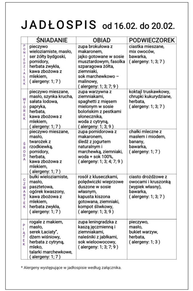 JADŁOSPIS od 13.02. do 17.02.