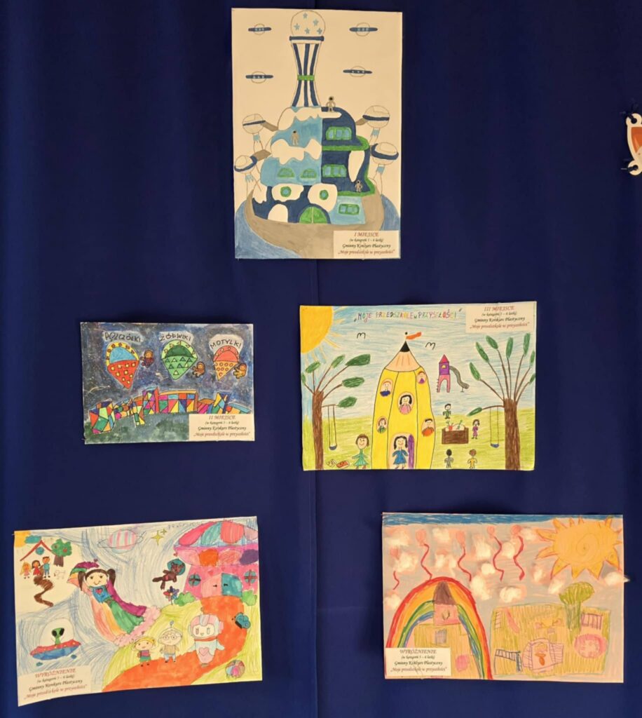 Jury, pod przewodnictwem Pani Dyrektor Beaty Kabacińskiej, dokonało wyboru zwycięskich prac. Zadanie nie było łatwe, ponieważ wszystkie prace zachwycały pomysłowością, kreatywnością i dziecięcą wizją przyszłości, ale po długich naradach wyłoniono zwycięzców: