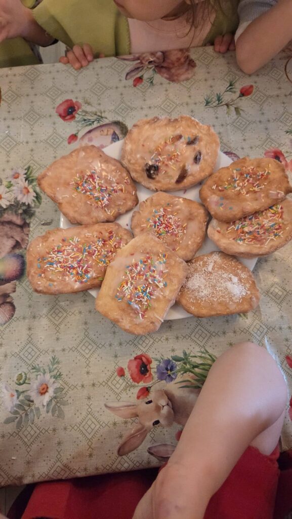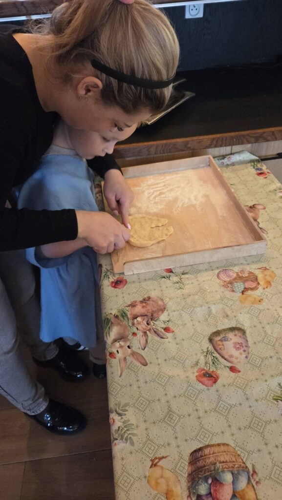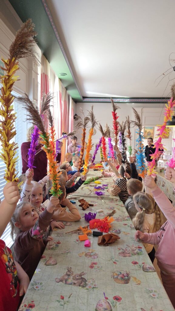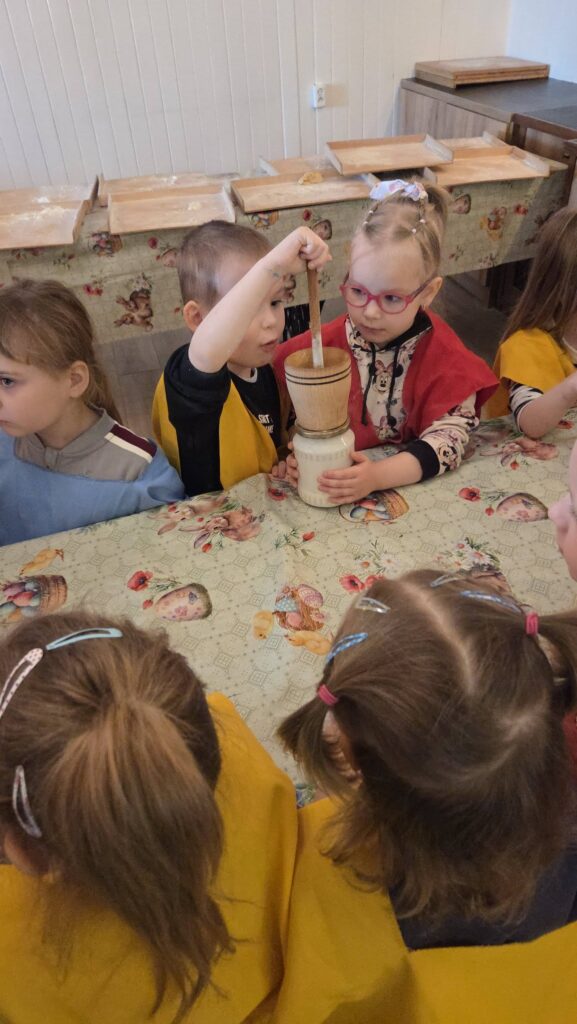 Następnie wykonały kolorowe palmy wielkanocne ,malowały ozdoby świąteczne, ubijały masło ze śmietanki. Z masła powstały piękne baranki. Nie mogło również zabraknąć mazurka, którego dzieci samodzielnie ozdobiły bakaliami i posypką.